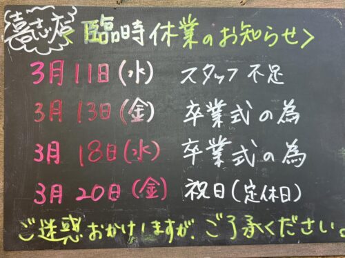 11日(水)、23日(月)は藤沢台店、喜志店ともに祝日でお休みとなります。